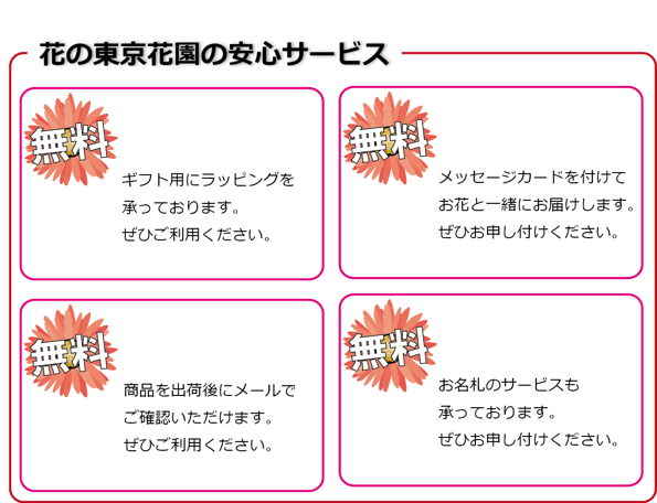 お店ではラッピングやメッセージカードなど無料サービスを常に行っておりますが、ご来店者を対象に切り花の無料プレゼントも不定期に行っております。切り花無料プレゼントは、Twitterを通じてお知らせ致しますので、是非フォローをお願い致します。